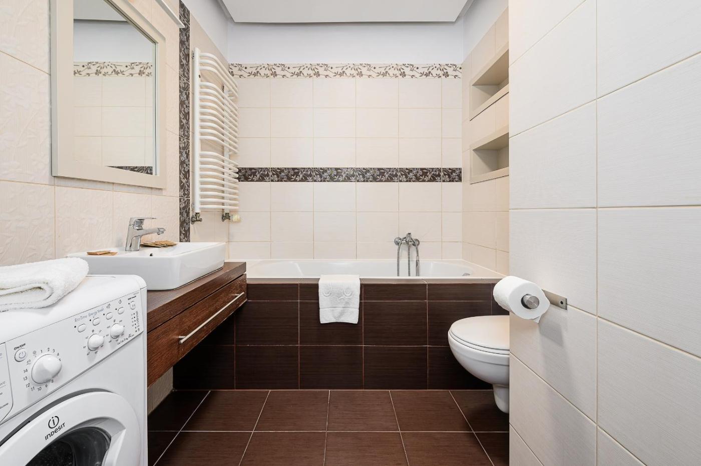 Apartament typu studio. This apartment includes 1 living room, 1 separate bedroom and 1 bathroom with a bath and a hairdryer. In the well-equipped kitchen, guests will find a stovetop, a refrigerator, a dishwasher and kitchenware. The apartment has parquet floors, a seating area with a flat-screen TV with cable channels, a washing machine, a tea and coffee maker, as well as a wardrobe. The unit has 2 beds. Apartament - 4 osobowy. Powierzchnia pokoju ok.: 40 mkw.